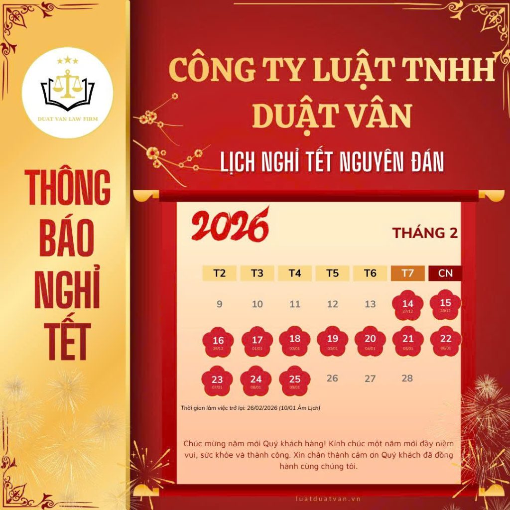Công ty Luật TNHH Duật Vân xin trân trọng thông báo tới Quý Khách hàng và Quý Đối tác lịch nghỉ Tết Nguyên Đán năm 2026 như sau: